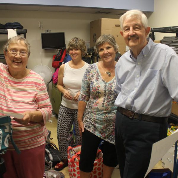 Leslie Ross, parish and board relations administrator, has coordinated all ECS drives for two years now. “[We] had some amazing volunteers who came in to help me,” Leslie said. “And I couldn’t have managed without them!” The Cutlers went down the checklist, bringing together pencils, notebooks, calculators and such, to stuff backpacks for elementary, middle, and high school students. Bags were then coded by recipient grade-level to make distribution a breeze.